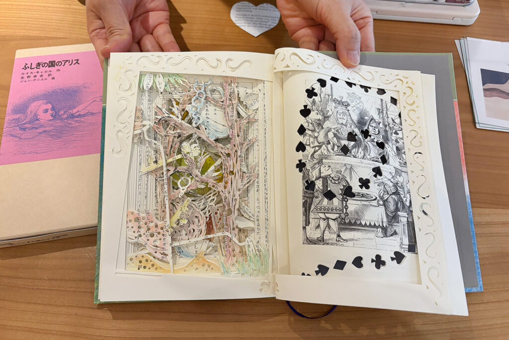 子供の頃から本が大好きだった小林雅子さんは、その本を素材にしたちょっと変わった立体的なアート作品を作り出します。仕掛け絵本とはまた違う、細かくカットしながらその本の幻想的な世界を表現します。今回は時間の関係で、小林さんが作品で作った残りの紙オブジェを使って、フレームにそれぞれのアートを制作しました。