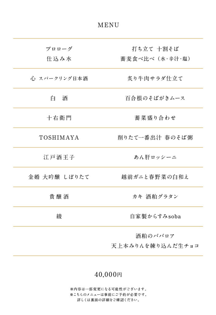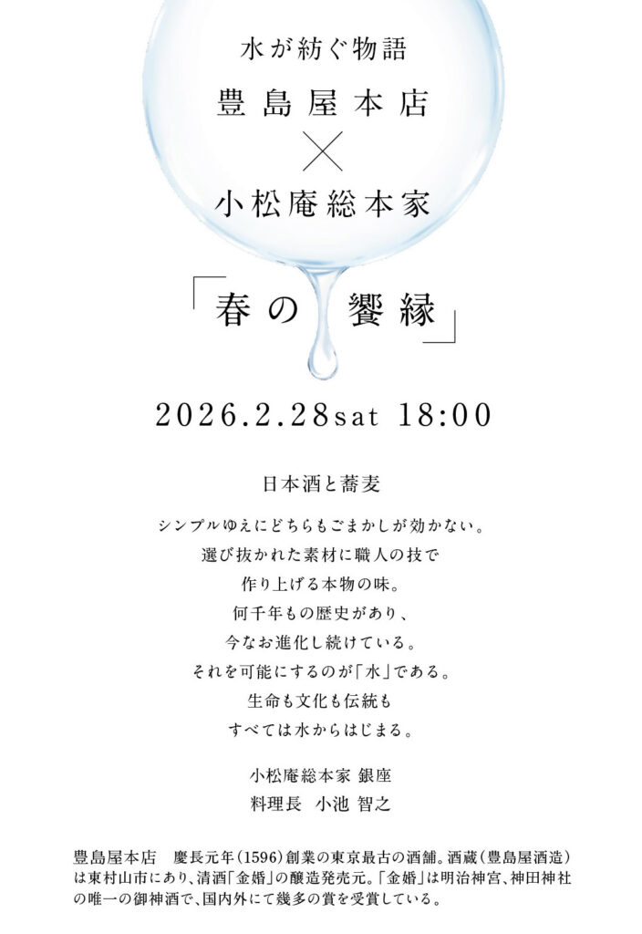 このたび小松庵総本家 銀座は「日本酒と蕎麦」を愉しむ限定コースをご提案させていただくことになりました。東京の酒蔵「豊島屋本店」と東京の蕎麦「小松庵総本家」とのコラボレーション、水が紡ぐ物語「春の饗縁」です。